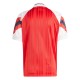 球衣延续红色底色,面料织入纵向暗纹,搭配经典白色衣袖,袖口饰以红色和海军蓝的经典阿迪达斯三条纹图案...